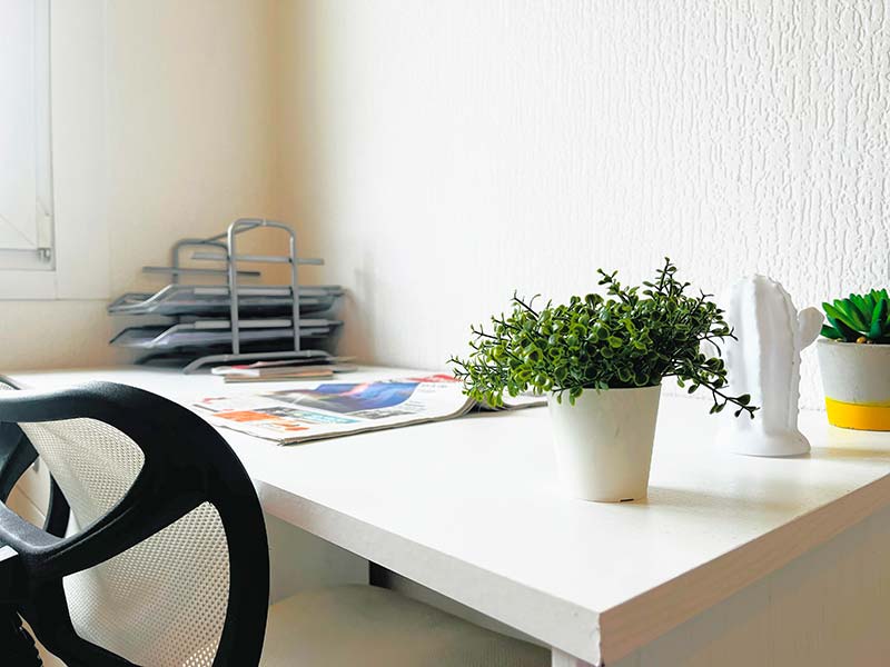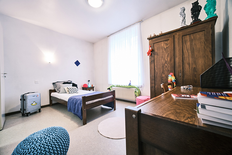 Chambres individuelles avec lit simple, table chevet, bureau et rangement,