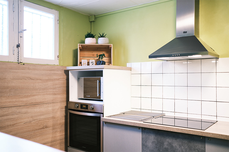 Cuisine équipée : table, chaises, four, micro-ondes, réfrigérateur, vaisselle, plaques de cuisson,machine à laver